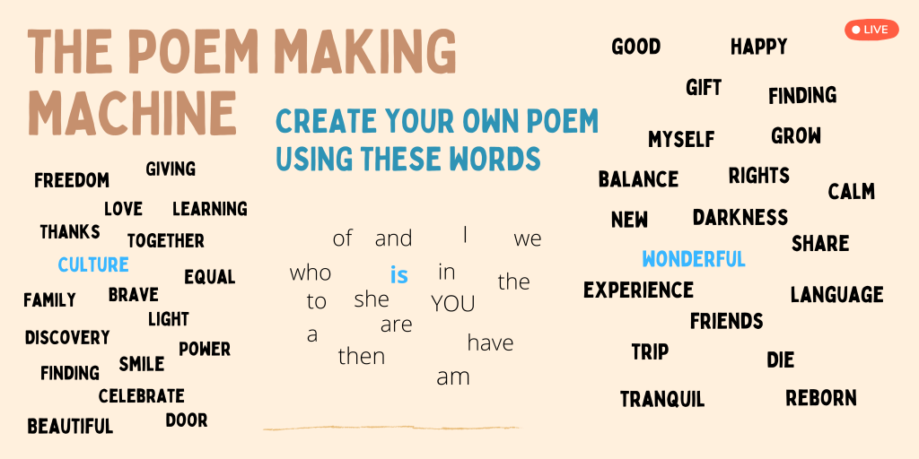 All the words used in the poem making machine came from the stories in the drawers. So many of these stories resonate with us for different reasons. Here you can connect with the stories and create your own poems that will have a special meaning to you.